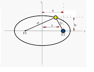 Berdasarkan suara diatas menjelaskan bahwa planet yang mengelilingi matahari berbentuk lintasan elips. Dari gambar diatas matahari berada di titik F1 maupun F2. Planet ditandai dengan r1 oleh F1 serta r2 oleh F2. Apabila planet berubah posisi maka jarak antara r1 maupun r2 juga berubah. Garis a merupakan sumbu semimayor sedangkan 2a merupakan mayor. Garis b merupakan semiminor sedangkan 2b merupakan minor. Garis c merupakan titik fokus yng menjadikan rumus c2= a2+b2. Untuk memilih bentuk elips memakai rumus eksentrisitas (e) elips. Dengan eksentrisitas elips yang semakin kecil akan menciptakan bentuk elips ibarat bentuk lingkaran. Apabila eksentrisitas elips yang semakin besar maka bentuk elips akan semakin tipis serta memanjang. Perbandingan garis c dengan garis a sanggup ditulis menjadi e=c/a. Untuk nilai dari eksentrisitas besarnya antara lebih dari 0 dan kurang dari 1.
